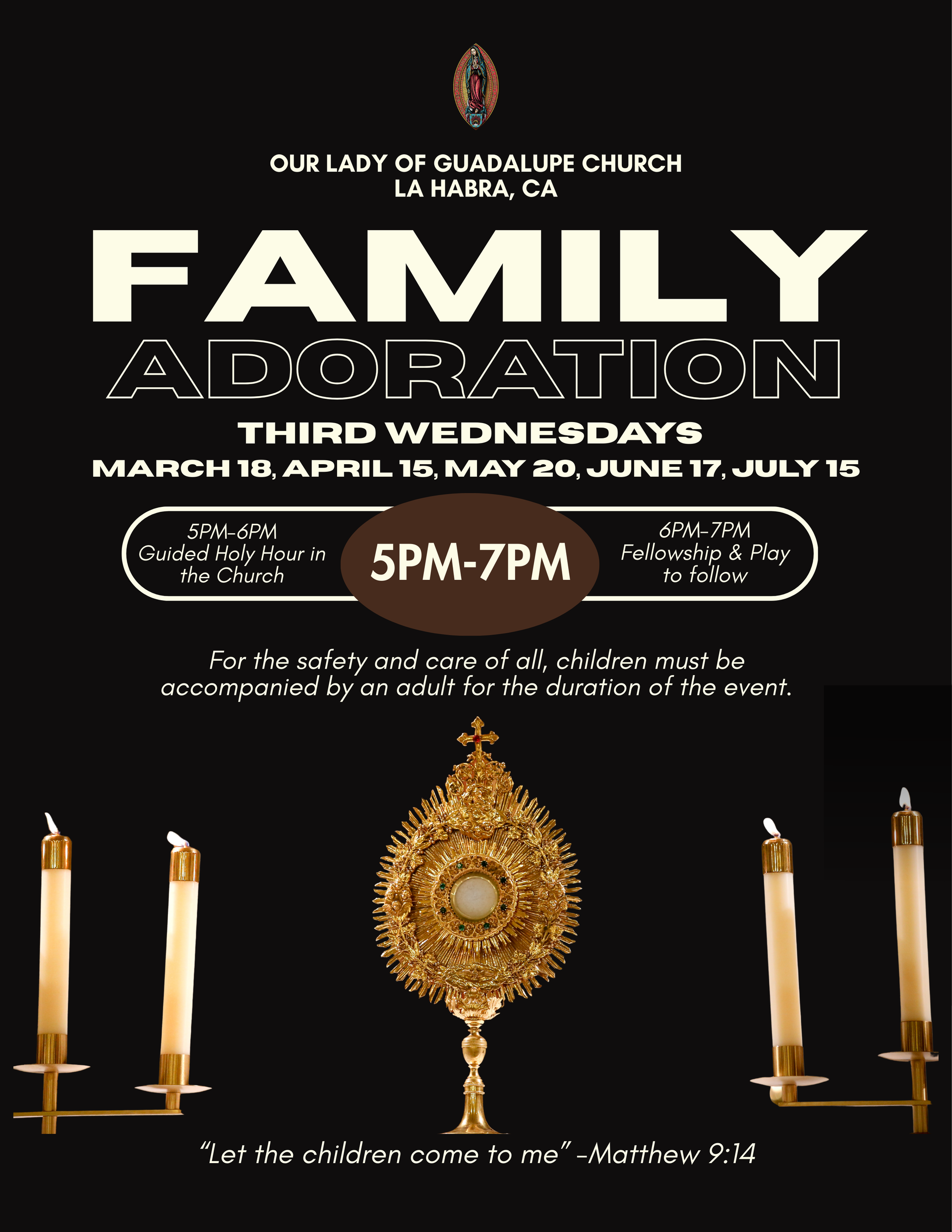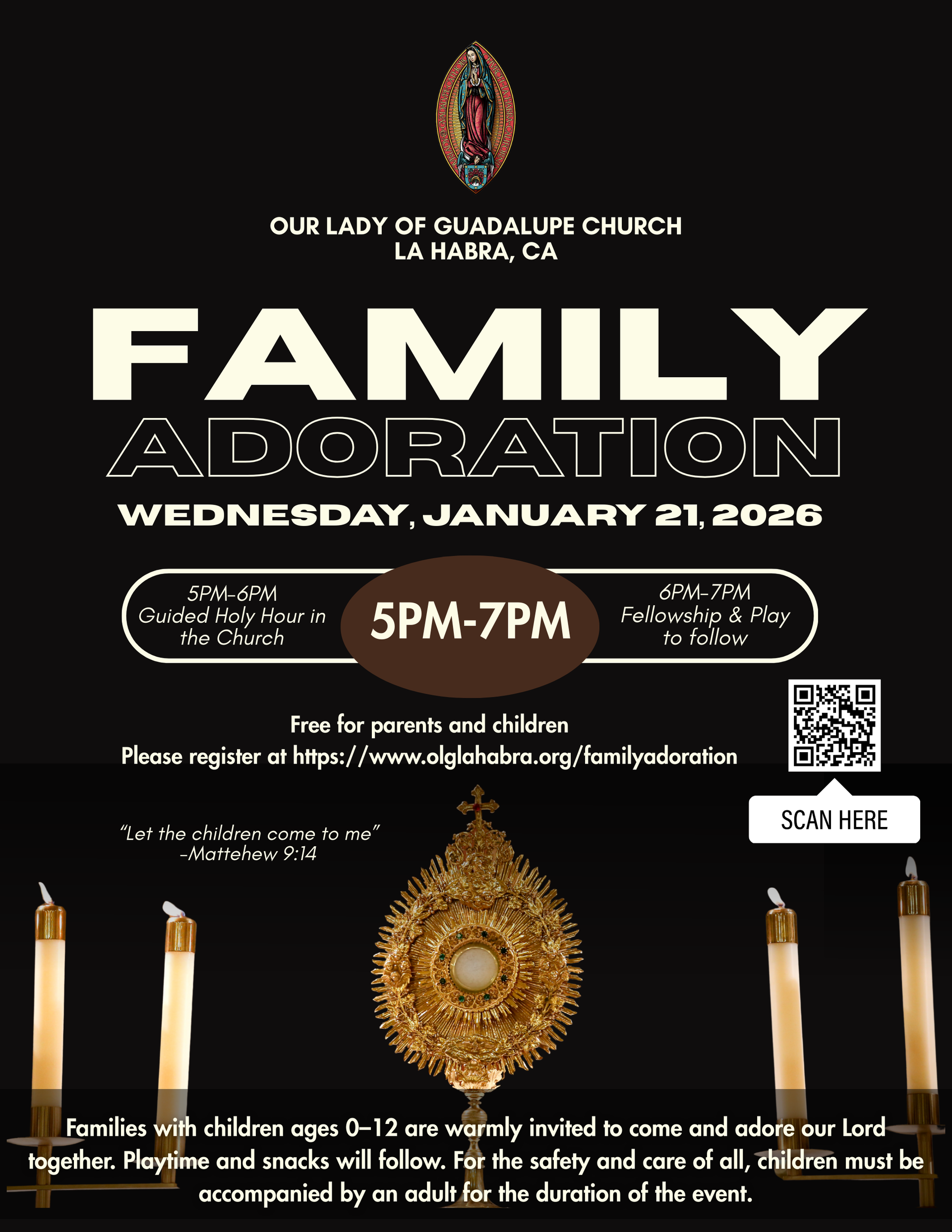 Families with children ages 0–12 are warmly invited to come and adore our Lord together. Playtime and snacks will follow. For the safety and care of all, children must be accompanied by an adult for the duration of the event.