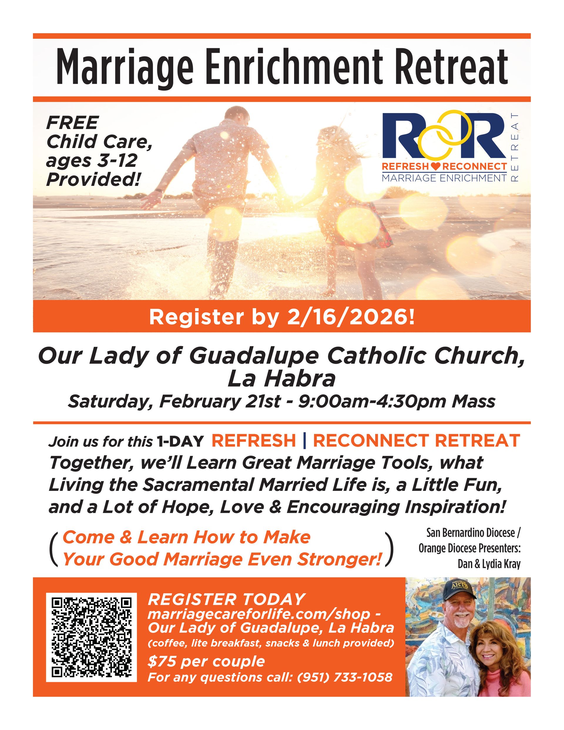 We are partnering with Marriage Care for Life to bring you this one-day retreat. Come reconnect with your spouse, meet other like-minded couples, learn a few tools, and enter deeper into the Sacrament of Holy Matrimony. At the retreat, we will provide a light breakfast, lunch, and day care*. Cost is $75 per couple. For any questions, please contact (951) 733-1058.